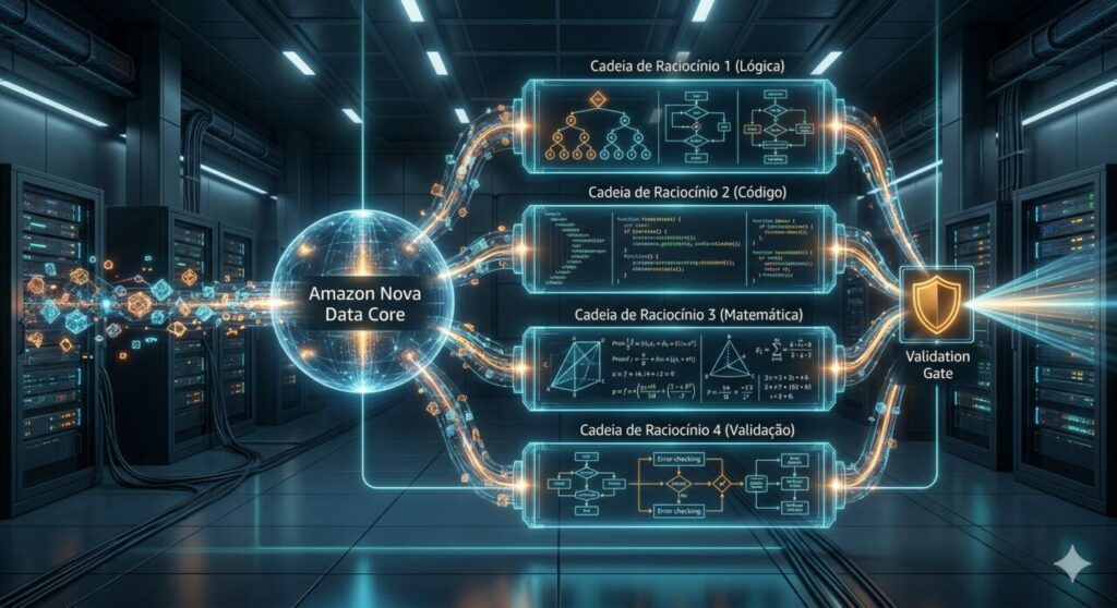 O Extended Thinking com Amazon Nova não é apenas um “recurso a mais”; é uma mudança de paradigma na computação neural. Em vez de simplesmente prever o próximo token com base em probabilidades estatísticas imediatas, o modelo agora possui um espaço de manobra cognitivo para deliberar, testar hipóteses internas e validar sua própria lógica antes de entregar o output final.