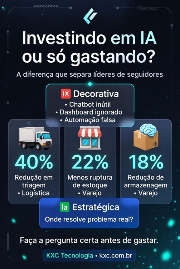 A maioria das empresas adotou IA nos últimos dois anos. Mas poucas conseguem responder a uma pergunta simples: qual foi o retorno real disso? Neste artigo, vamos explorar a diferença entre usar IA de forma decorativa e usá-la como uma verdadeira alavanca de resultado — com menos custo e mais impacto.