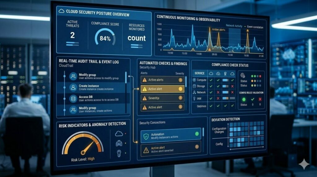Painel conceitual de segurança em nuvem na AWS com indicadores de monitoramento, conformidade e proteção de dados